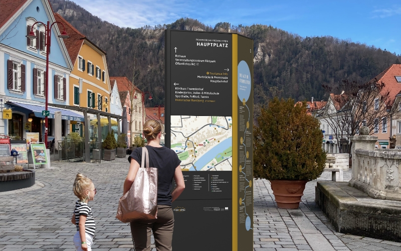 Nahezu parallel zur Produktgestaltung startete auch die grafische Konzeption – natürlich von Beginn an eng abgestimmt mit dem Produktdesign. Schon in den ersten Phasen standen zentrale Fragen im Raum: Welche Schriftart und -größe sorgt für beste Lesbarkeit? Wie lässt sich das Branding der Stadt Frohnleiten geschickt integrieren – und gleichzeitig so offen gestalten, dass es auch für andere Gemeinden adaptierbar ist? Welche Informationen müssen auf welcher Höhe angebracht sein, damit sie barrierefrei wahrgenommen werden?
